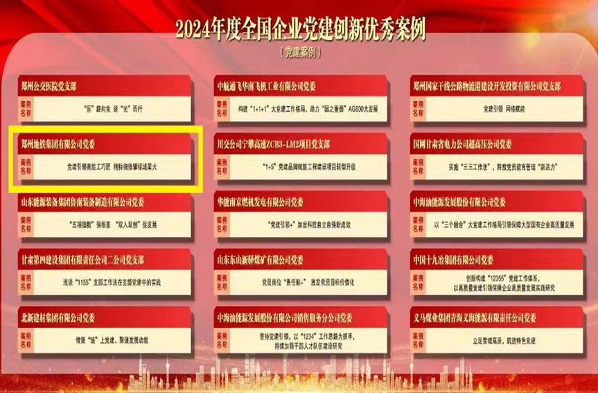 近日,2024全國企業(yè)黨建(案例)研討會暨第四屆企業(yè)黨建創(chuàng)新優(yōu)秀案例發(fā)布儀式在北京成功舉辦。鄭州地鐵集團有限公司黨委黨建品牌案例《黨建引領育能工巧匠 精檢細修耀綠城星火》成功入選“2024年度全國企業(yè)黨建創(chuàng)新優(yōu)秀案例”,黨建品牌“綠城星火”在全國企業(yè)黨建工作中再獲殊榮。