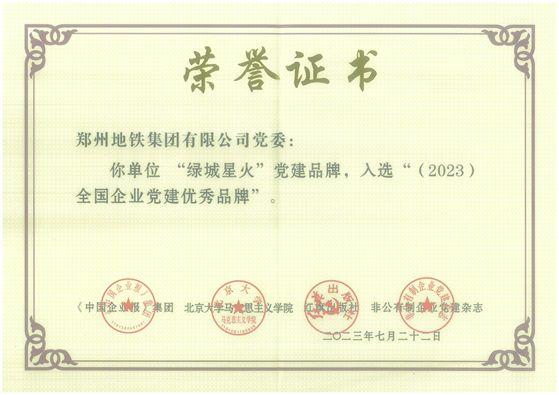 12660鄭州地鐵集團黨委“綠城星火”黨建品牌被授予“2023年度全國企業(yè)黨建優(yōu)秀品牌”榮譽稱號