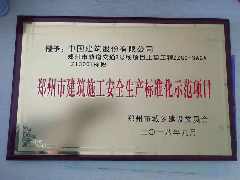 近日,鄭州市軌道交通3號線世行3001標(biāo)、世行3002標(biāo)、A2部分三工區(qū)等項目,先后榮獲鄭州市城鄉(xiāng)建設(shè)委員會頒發(fā)的“鄭州市建筑施工安全生產(chǎn)標(biāo)準(zhǔn)化示范項目”獎牌及榮譽證書。